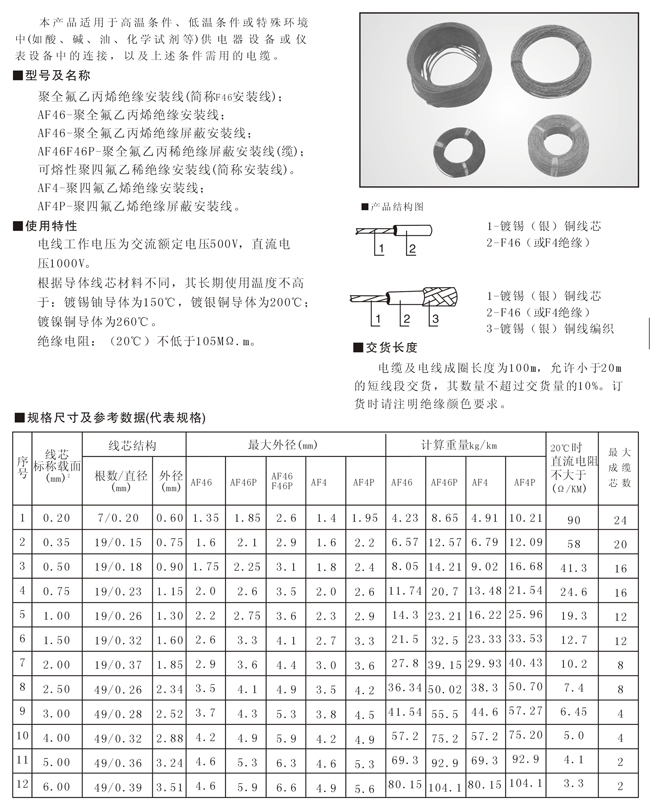 耐高温氟塑料安装线及电缆